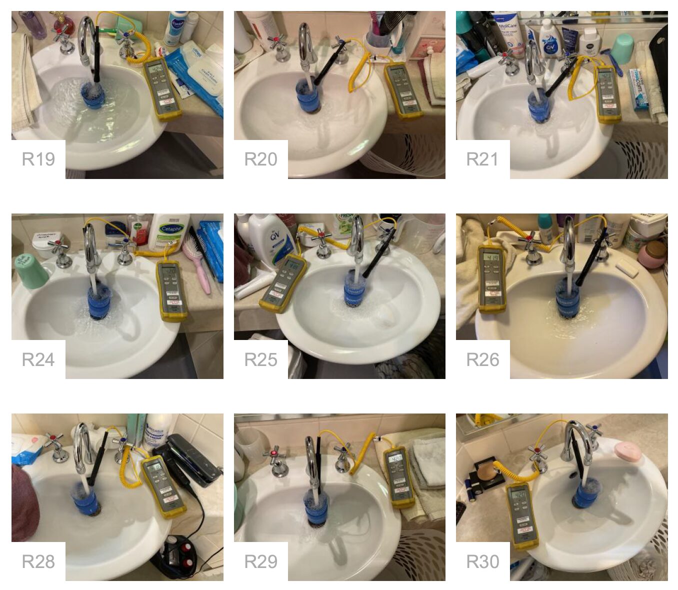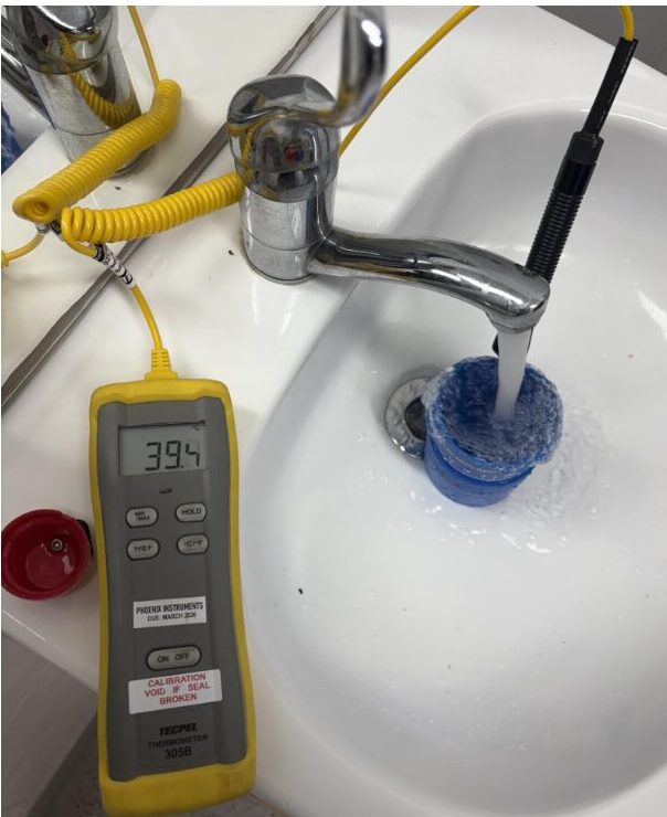 Temperature checks confirm that hot water is maintained at the required levels (minimum 60°C at the source and 50°C or 45°C at outlets, depending on the environment) and that cold water remains below 20°C. Maintaining these parameters minimises bacterial risk while ensuring outlet temperatures remain safe for residents.